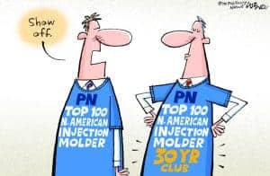 So, which top 100 firms are still ranked today? Those include: Cascade Engineering Inc. of Grand Rapids, Mich.; Evco Plastics Inc. of DeForest, Wis.; Flambeau Inc. of Baraboo, Wis.; Hoffer Plastics Corp. of South Elgin, Ill.; Jones Plastic & Engineering Co. LLC of Jeffersontown, Ky.; Lacks Enterprises Inc. of Grand Rapids, Mich.; Nypro Inc. of Clinton, Mass.; Phillips-Medisize Corp. of Hudson, Wis.; and Plastic Products Co. Inc. of Lindstrom, Minn.